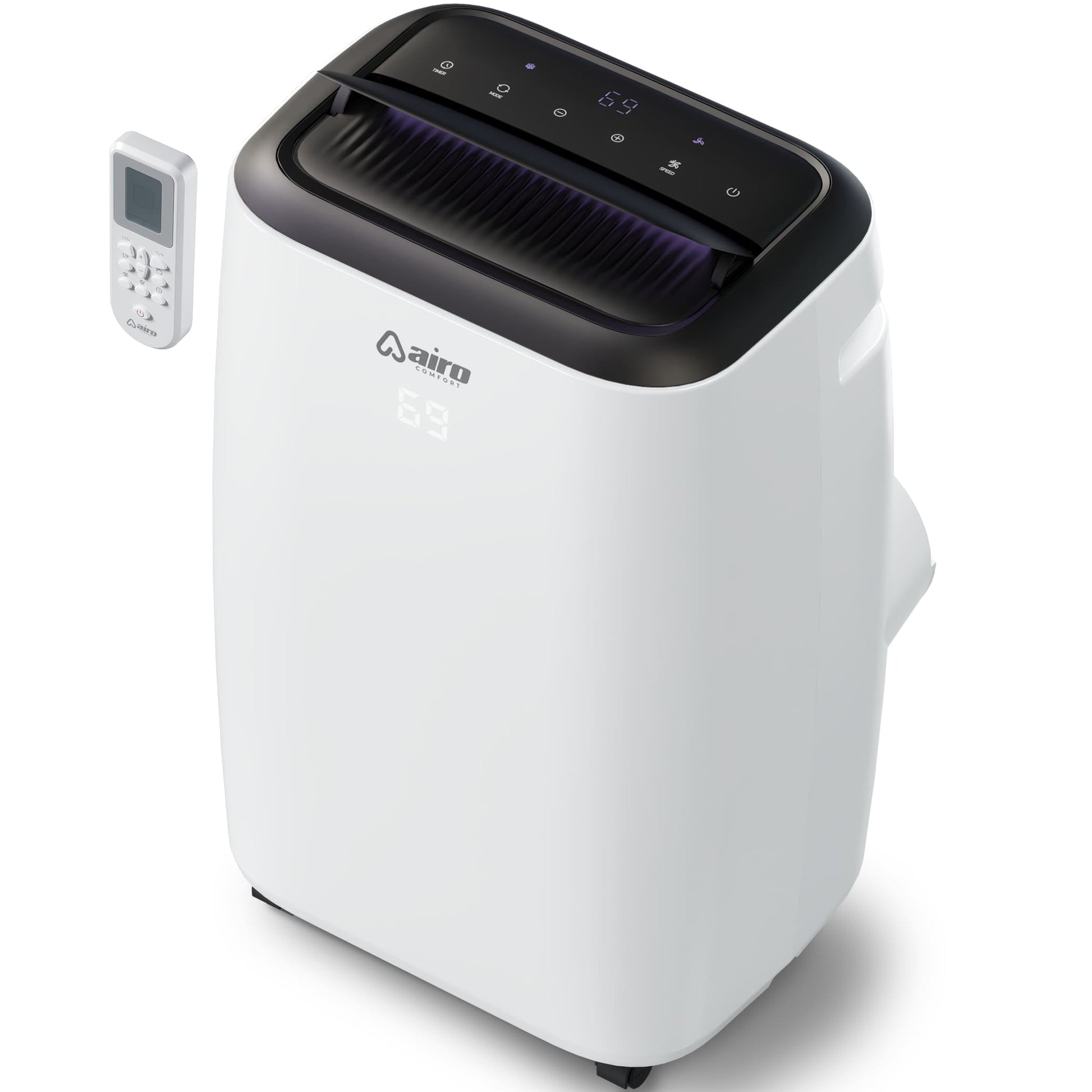 Make home a sanctuary again with the Airo Comfort Portable Air Conditioner 8000 BTU. Designed to fit your life-in both sliding and hung windows this unit cools up to 350 sq. ft. without disruptive white noise. Plus the vertical swing function distributes airflow for maximum cooling.Take control of your home comfort even on the most extreme days. Simply Cool Comfort shouldn't be complicated. That's why every Airo Comfort portable air conditioning unit is so easy to transport install and operate right out of the box. Simple LED controls let you adjust speed and power across cooling fan and dehumidifier modes. Four caster wheels allow for effortless movement from room to room where installation is a breeze in any horizontal or vertical window. Your home should be your safe haven from the heat. We make it simple