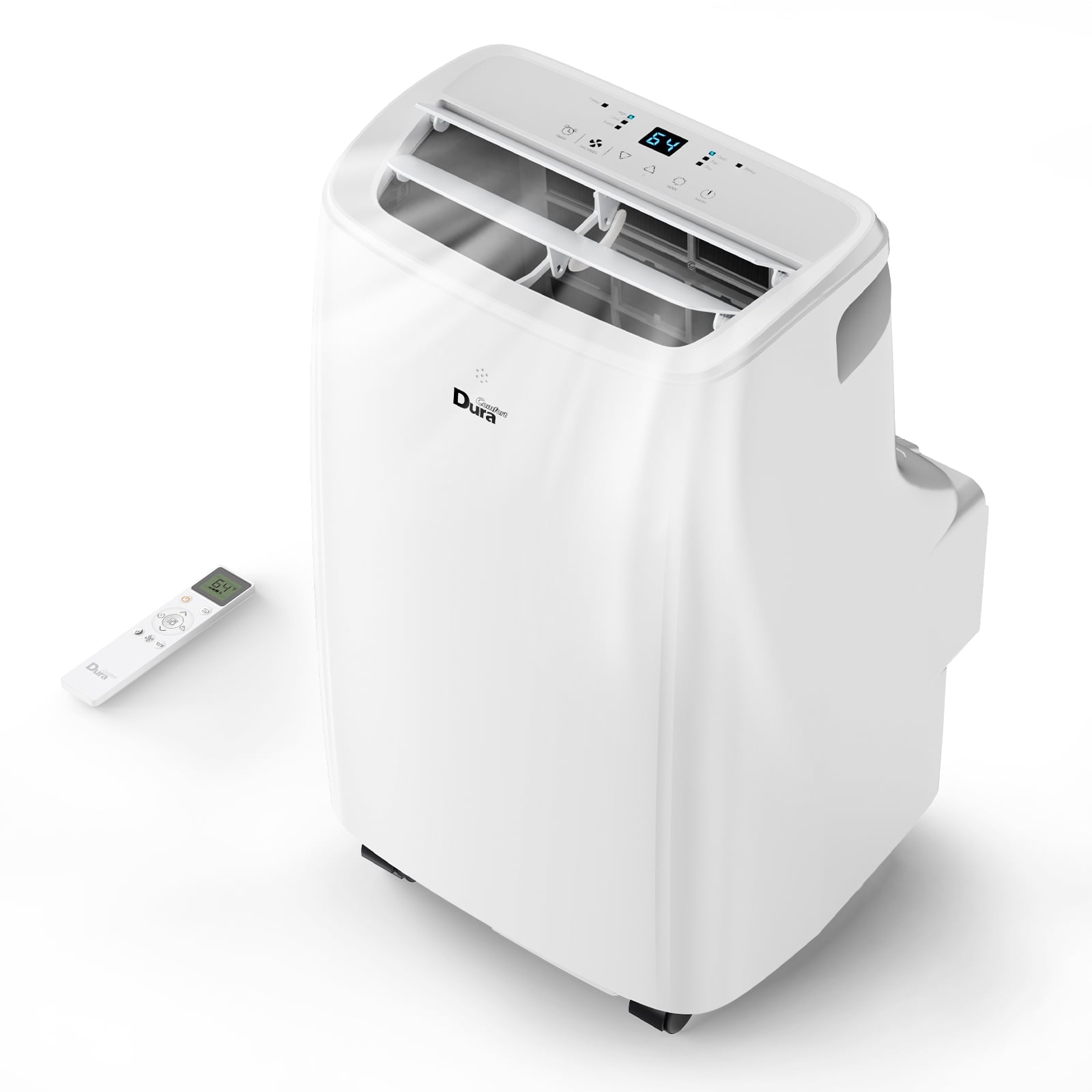 DuraComfort 8000 BTU Ashrae portable air conditioner quietly and efficiently cools rooms with sliding window openings measuring between 200 Sq Ft This portable AC measures 15.3x14.0x24.8 includes 4 wheels for smooth mobility and is equipped with an automatic vertical swing function to evenly distribute airflow. Easy-to-read large digital LED display control panel offers all access settings. Full function remote control lets you control the air from conditioner your couch or bed.