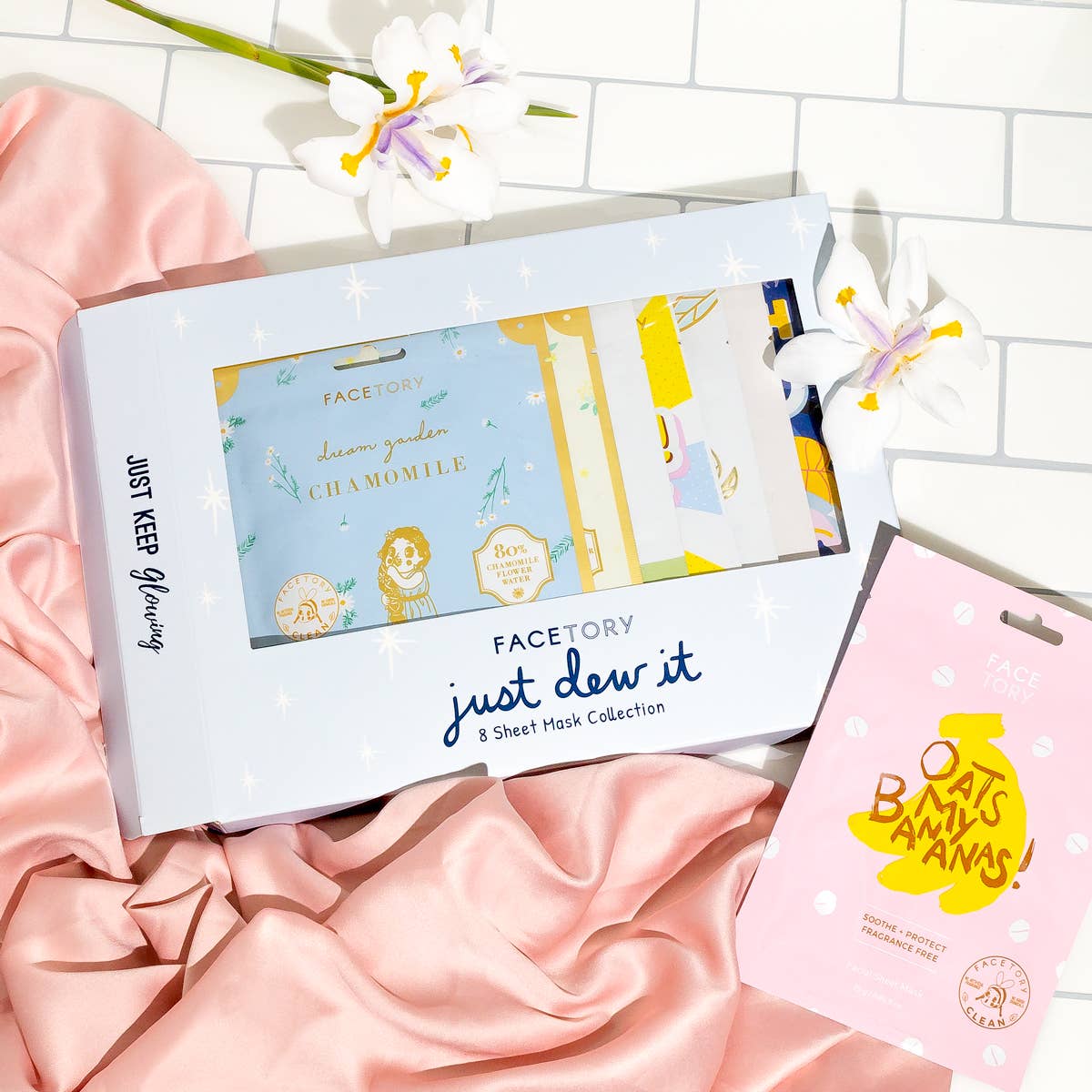 Did you hear? A dewy and natural glow to the skin is all the rage right now! Get a plump, soft, and supple look with our go-to selection of perfect dewy skin sheet masks! Each mask features a key ingredient that helps add and maintain hydration, ensuring your complexion feels comfortable, nourished, and satisfied! Included in Just Dew It (8 sheet masks): Woah That H2O 2-Step Sheet Mask Oh My Goodness Rejuvenating Snail Sheet Mask Ace That Face Collagen Sheet Mask Be Bright Be You Sheet Mask SOS Royal Jelly Sheet Mask Dream Garden Elderflower Sheet Mask Dream Garden Chamomile Sheet Mask Oats My Bananas! Sheet Mask
