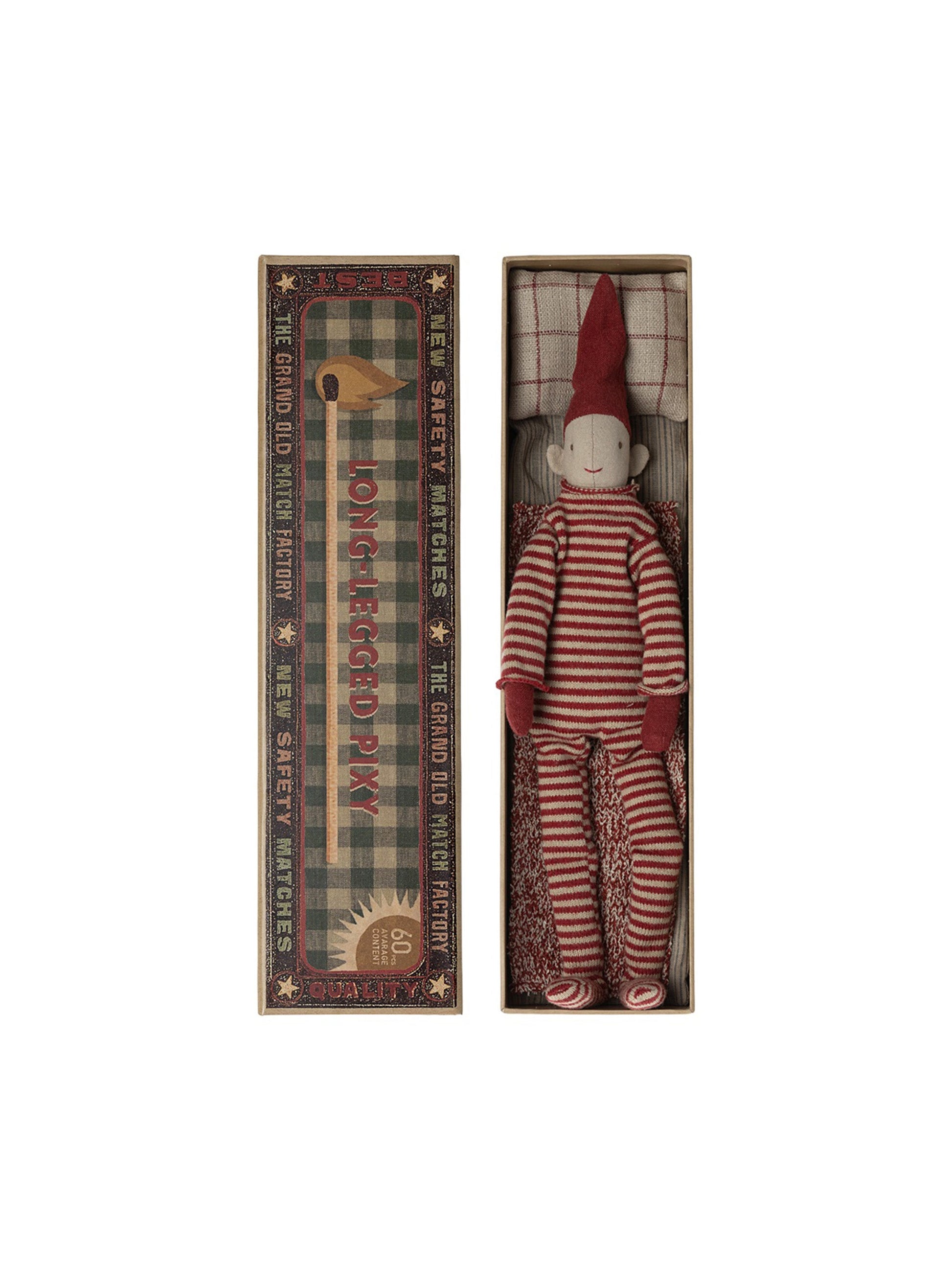 This pixy wears a knitted suit and has magnets in hands so it can hang or sit everywhere. It comes in a decorative matchbox with soft bedlinen inside.