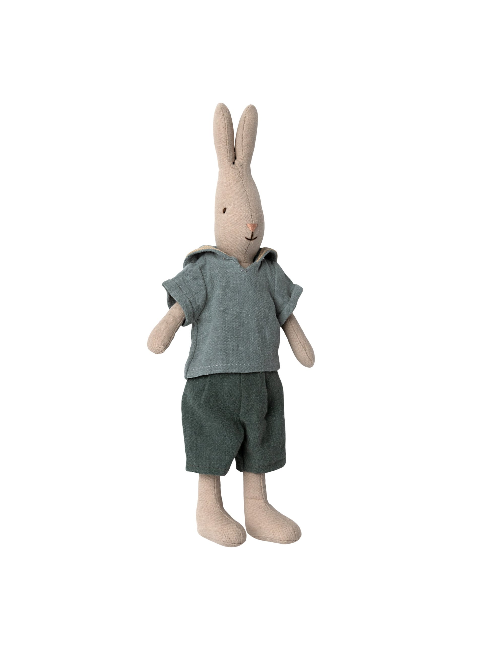 A classic rabbit made of soft natural linen and cotton fabric that gives a lovely hand feel and look. Size 2 rabbits fit into the Maileg dollhouse and all furniture size Mini. Buy loose clothes separately to expand the rabbit's wardrobe.